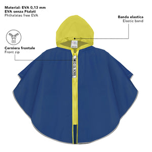 Perfetta per piccoli esploratori, questa mantellina antipioggia in tinta unita blu con cappuccio giallo accende le giornate più grigie! Facile da indossare grazie alla comoda zip frontale e pensata per garantire massima visibilità con i suoi dettagli catarifrangenti. Leggera, pratica e pronta per ogni missione sotto la pioggia! Il tessuto è EVA, conforme alle normative di sicurezza e privo di sostanze tossiche. I dettagli riflettenti consentono di essere visibili anche al buio, assicurando il massimo della sicurezza. Disponibile in un'unica taglia, è ideale per bambini dai 3 ai 6 anni. Un accessorio da non lasciarsi scappare!