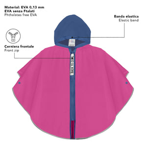 Vivace come un arcobaleno, pratica come una coccola! Questa mantellina antipioggia in tinta unita fucsia con cappuccio viola è perfetta per affrontare le giornate piovose con stile e allegria. Dotata di zip frontale per una chiusura facile e veloce, e dettagli catarifrangenti per essere sempre visibili anche quando il cielo si fa grigio. Il tessuto è EVA, conforme alle normative di sicurezza e privo di sostanze tossiche. I dettagli riflettenti consentono di essere visibili anche al buio, assicurando il massimo della sicurezza. Disponibile in un'unica taglia, è ideale per bambine dai 3 ai 6 anni. Un accessorio da non lasciarsi scappare!