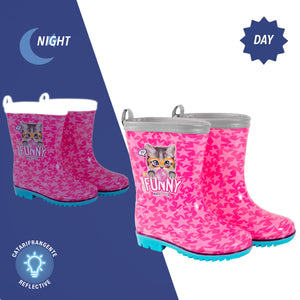 Questi stivaletti da pioggia sono perfetti per le piccole esploratrici, con dolci gattini pronti a giocare sotto la pioggia. Ogni passo diventa un’avventura tenera e divertente! I profili catarifrangenti garantiscono il massimo della visibilità anche durante le giornate più buie perché capaci di riflettere la luce. Grazie ai nostri stivaletti, camminare sotto la pioggia sarà ancora più sicuro. Realizzati in PVC con interno foderato in cotone, sono facili da pulire e comodi da indossare. La suola azzurra è antiscivolo: la punta e il tallone rinforzato consentono una maggiore aderenza e stabilità su ogni tipo di terreno, rendendoli per camminare e giocare sotto la pioggia, mantenendo i piedi asciutti. I materiali utilizzati sono privi di sostanze tossiche, rispettando la salute dei bimbi e l'ambiente.