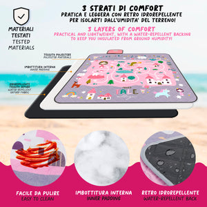 Con i suoi 150x150 cm, questo telo picnic è l’alleato ideale per 2-3 bambini pronti a divertirsi all’aria aperta. Il fondo in PEVA idrorepellente li protegge dall’umidità, permettendo di giocare, disegnare e fare merenda senza pensieri.