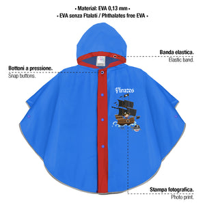 Mantellina impermeabile blu con forma arrotondata e dettagli laterali rossi. Bottoni a pressione sulla parte frontale e cappuccio antivento. I profili sono catarifrangenti e garantiscono la massima visibilità perché capaci di riflettere la luce ed illuminarsi quando incrociano i fari delle auto. Disponibile in una taglia unica e ideale per i bambini dai 3 ai 6 anni.