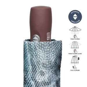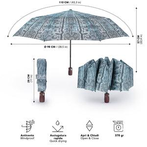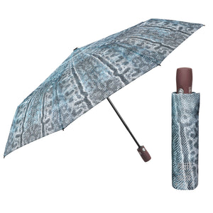Questo ombrello dal carattere audace è decorato con un’elegante stampa pitonata, disponibile in due varianti: un vivace pitonato rosa e un raffinato pitonato azzurro. Perfetto per chi ama distinguersi anche nei giorni di pioggia, unisce personalità e funzionalità grazie alla struttura resistente e ai dettagli curati.
