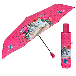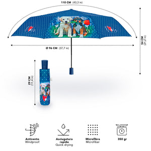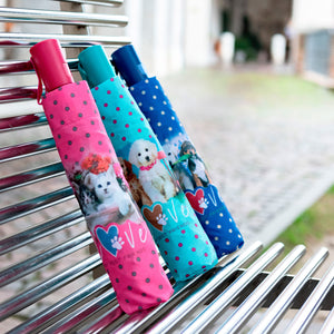 Questo ombrello pieghevole è un concentrato di dolcezza, perfetto per trasformare ogni acquazzone in un momento spensierato. Scegli il tuo compagno di pioggia preferito tra le tre adorabili varianti: cagnolini su sfondo blu, gattini su sfondo fucsia o teneri cuccioli su sfondo azzurro. Struttura resistente e compatta con bacchette in fibra di vetro, che garantiscono leggerezza e flessibilità anche nelle raffiche di vento più intense. Il tessuto in microfibra ad asciugatura rapida assicura praticità ed è completamente privo di sostanze nocive. Design a tre sezioni con apertura automatica per un utilizzo semplice e immediato.
