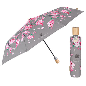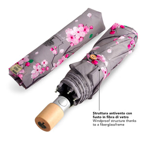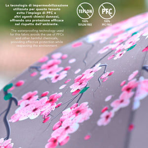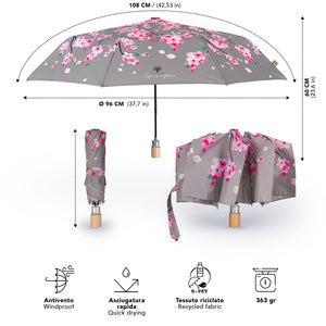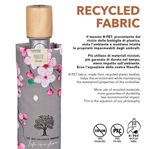 Un accessorio che emana l'atmosfera primaverile e ti trasporta tra alberi colorati, aria fresca e fiori che sbocciano. Un ombrello elegante e dai toni delicati che regala vitalità ad ogni giornata grigia. Un mini ombrello automatico con un manico in legno non trattato e un tessuto riciclato per rispettare l’ambiente e ridurre gli sprechi. Grazie a bottiglie di plastica riciclate, prima ridotte in filamenti e poi trasformate in fibre di alta qualità otteniamo un tessuto RPET, altamente ecologico. L’ombrello è inoltre molto resistente grazie alla struttura in fibra di vetro , ti protegge da pioggia e vento pur essendo pratico e leggero.