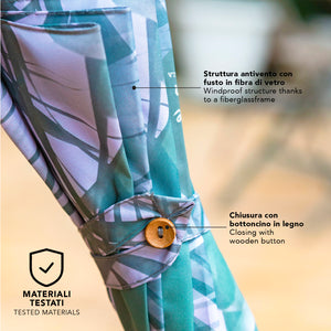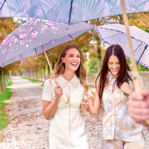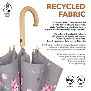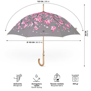 Un accessorio che emana l'atmosfera primaverile e ti trasporta tra alberi colorati, aria fresca e fiori che sbocciano. Un ombrello elegante e dai toni delicati che regala vitalità ad ogni giornata grigia. Con un manico in legno non trattato e un tessuto riciclato per rispettare l'ambiente e ridurre gli sprechi. Grazie all'utilizzo di bottiglie di plastica riciclate, trasformate in filamenti di alta qualità, otteniamo un tessuto RPET, altamente ecologico. Inoltre, la struttura in fibra di vetro rende l'ombrello molto resistente, proteggendoti dalla pioggia e dal vento in modo leggero e pratico. Dotato di apertura automatica, facile da usare.
