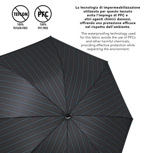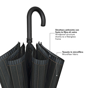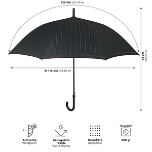 Un ombrello dallo stile essenziale che unisce la sobrietà dello sfondo nero alla raffinatezza di una trama rigata, disponibile in due varianti: con riga verde per un accento deciso o con riga marrone per un’eleganza più calda e classica. Perfetto per accompagnare look formali e casual, è l’accessorio ideale per affrontare la pioggia con stile discreto ma distintivo.
