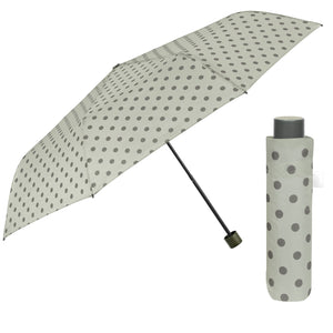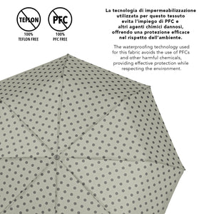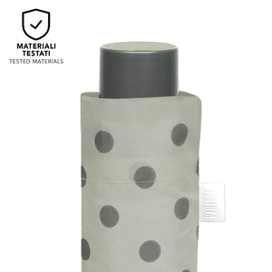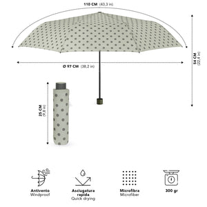 Con questo ombrello manuale, ogni nuvola si trasforma in un’occasione di stile. La fantasia a pois regala un’irresistibile allegria, mentre le tre varianti colore — un raffinato grigio chiaro, un fresco verde acqua e un vivace viola — permettono di scegliere l’umore con cui sfidare la pioggia. Leggero e facile da portare sempre con te, è l’alleato perfetto per colorare anche le giornate più grigie. Progettato per resistere al vento, questo ombrello è dotato di bacchette in fibra di vetro che assicurano solidità e flessibilità anche durante le raffiche più forti. Il tessuto a trama compatta, arricchito da uno speciale trattamento in resina, garantisce un’asciugatura ultrarapida ed è completamente privo di sostanze nocive. Le dimensioni compatte consentono di portarlo sempre con te, in borsa, in uno zaino o durante un viaggio.