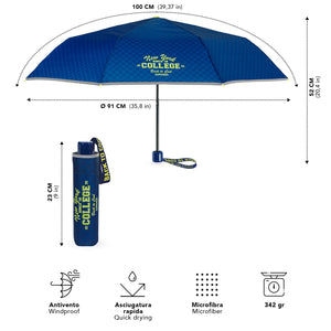 Compatto, leggero e con grinta da vendere! Questo ombrellino pieghevole a stampa college è perfetto per i bambini più grandi che vogliono affrontare la pioggia con stile. Facile da aprire manualmente e comodo da infilare nello zaino, è l’accessorio ideale per la scuola e il tempo libero. Pioggia? Nessun problema: c'è il look giusto per ogni giornata! L'ombrello è dotato di un'apertura manuale di sicurezza e puntine salvadito, a prova di bambino. Struttura antivento con bacchette in fibra di vetro che lo rende resistente e durevole. Bordo catarifrangente capace di riflettere la luce e illuminarsi quando incrocia i fari delle automobili, per una massima visibilità. Consigliato per bambini a partire dai 7 anni.