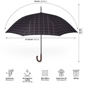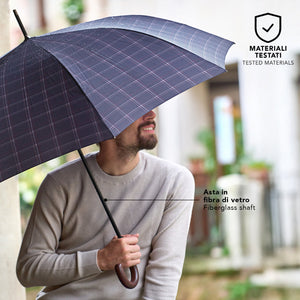 Un ombrello classico ed elegante con fantasia scozzese per l’uomo che cerca un accessorio di alta qualità senza rinunciare ad uno stile raffinato. La collezione Technology offre accessori da pioggia di elevata qualità che coniugano colori e fantasie classiche con il massimo della praticità e dell'innovazione. Il tessuto è a trama fitta e la speciale resinatura idrorepellente garantisce all'ombrello un'asciugatura super rapida. Struttura antivento dotata di asta e innovative bacchette in fibra di vetro che lo rendono resistente anche alle raffiche di vento più forti. Dotato di comoda apertura automatica e disponibile in due varianti. Il regalo perfetto per ogni occasione.
