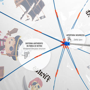 Ombrello trasparente a cupola con inserti blu e divertente fantasia con simpatico pirata . I profili sono catarifrangenti e garantiscono il top della visibilità in quanto capaci di riflettere la luce e illuminarsi quando incrociano i fari delle auto. Gli ombrelli della linea COOL KIDS presentano bacchette in fibra di vetro che rendono l'accessorio resistente al vento. L'apertura è manuale e facilitata grazie al sistema salva-dito, ideale per i bambini dai 3 ai 5 anni.