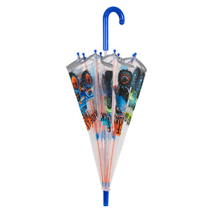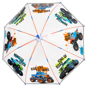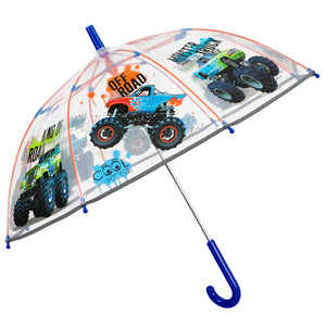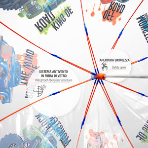 Ombrello trasparente a cupola con fantasia monster truck ideale per bambini di scuola materna e primaria. I profili catarifrangenti garantiscono il top della visibilità in quanto capaci di riflettere la luce e illuminarsi quando incrociano i fari delle auto, oltre ad essere una garanzia di sicurezza. Gli ombrelli della linea COOL KIDS presentano bacchette in fibra di vetro che rendono l'accessorio resistente al vento. L'apertura è manuale e facilitata grazie al sistema salva-dito, ideale per i bambini dai 4 ai 6 anni.