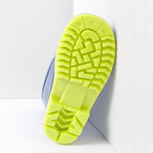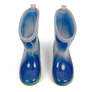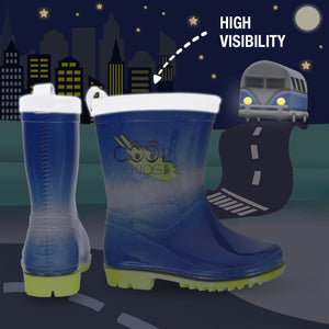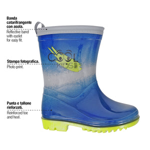 Ecco un must have per i piccoli fashionisti che amano sentirsi sempre un passo avanti. Questi stivaletti da pioggia impermeabili della linea Cool Kids in PVC accompagneranno il tuo bimbo nelle sue avventure quotidiane in caso di pioggia, neve e fango. Lo proteggeranno mantenendo i suoi piedi asciutti. Ma attenzione! Oltre a proteggerlo lo renderanno sicuro anche nelle giornate più buie grazie al bordo catarifrangente che brillerà sullo sfondo lucido blu sfumato. La suola di colore verde acceso è in tinta con il logo stampato sulla parte laterale esterna. Cosa aspetti ad acquistarli?