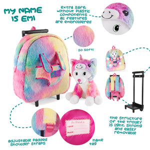 Questo morbido trolley con peluche removibile è il regalo ideale per bimbi della scuola materna. Il grazioso gattino può trasformarsi in un coloratissimo unicorno grazie al cappuccio abbassabile. Il peluche può anche essere rimosso per accompagnare il bimbo nei suoi momenti di gioco. I colori arcobaleno rendono lo zainetto unico e inconfondibile. Il carrello consente di utilizzare lo zainetto come piccolo bagaglio senza doverlo sollevare. Quest'ultimo può anche essere rimosso, per alleggerirlo e portarlo in spalla. Le bretelle sono perfettamente regolabili e adattabili alle spalle del bambino, per distribuire il peso in modo uniforme. Esplora la collezione Perletti Toys e regala al tuo piccolo un amico inseparabile!
