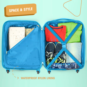 Trolley rigido azzurro da bambino con un stampa football. Pratica valigia da bimbo in ABS, materiale rigido, ultraleggero e con elevata resistenza ai graffi e agli urti. La struttura interna è composta da 2 divisori richiudibili. Chiusura sicura grazie al lucchetto con combinazione personalizzabile e 4 ruote girevoli che garantiscono stabilità e comfort di trasporto su tutte le superfici.