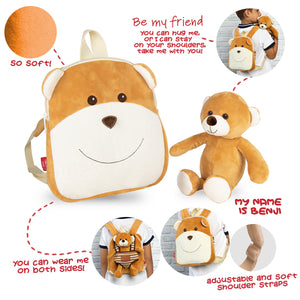 Zaino con peluche indossabile da entrambi i lati con un adorabile e morbido peluche che può essere rimosso e usato come giocattolo, diventando un compagno d'avventure fantastico per il tuo bambino che vorrà portare sempre con sé. La lunghezza della cinghia e delle bretelle dello zaino peluche può essere regolata, adattandosi perfettamente alle spalle del vostro bambino e distribuendo uniformemente il peso.