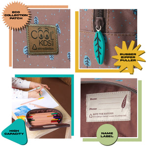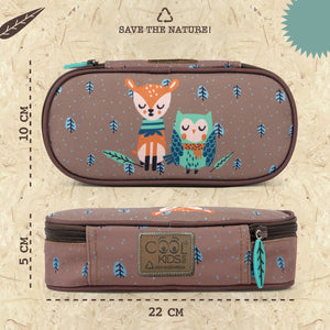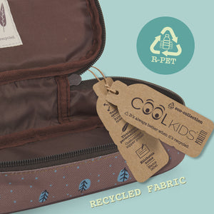 Questo astuccio fa parte della linea Cool Kids Eco Collection che comprende accessori realizzati con tessuti R-PET provenienti dal riciclo delle bottiglie di plastica. Una scelta ecologica, un regalo utile da portare con sé nel tempo libero o durante le giornate a scuola per riporre matite, penne e piccoli oggetti. La stampa colorata di un cerbiatto e un gufo con piccole foglie azzurre ci riportano al mondo della natura per imparare ad amarla fin da piccoli e prenderci cura del nostro pianeta. Praticità, spazio e materiali riciclati per un mondo green!