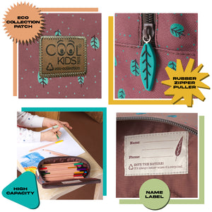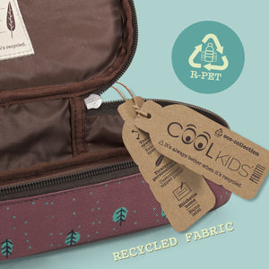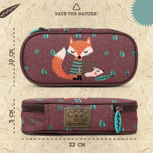Questo astuccio fa parte della linea Cool Kids Eco Collection che comprende accessori realizzati con tessuti R-PET provenienti dal riciclo delle bottiglie di plastica. Una scelta ecologica, un regalo utile da portare con sé nel tempo libero o durante le giornate a scuola per riporre matite, penne e piccoli oggetti. La stampa colorata di una volpe e di un riccio con piccole foglie verdi ci riportano al mondo della natura per imparare ad amarla fin da piccoli e prenderci cura del nostro pianeta. Praticità, spazio e materiali riciclati per un mondo green!