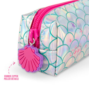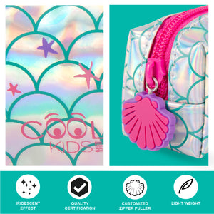L’effetto iridescente di questo piccolo astuccio lo rende un oggetto originale. E’ adatto alle bambine dai 2 ai 5 anni ed è utilizzabile sia come portamatite che come contenitore di piccoli giochi e accessori. La tiralampo gommata è molto originale in quanto è a forma di conchiglia rosa con bordino viola. L’accessorio è abbellito dalla stampa frontale di una Sirenetta con trama verde su fondo olografico.