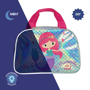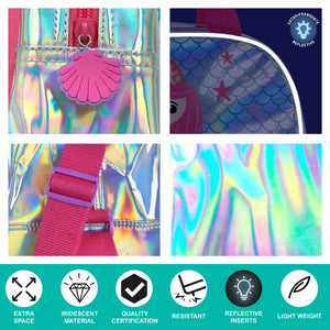 Borsa sport per piscina, palestra o altri sport con stampa sirenetta per bambina dai 2 ai 5 anni. Tiralampo gommata a forma di conchiglia rosa e viola. Stampa frontale di una sirenetta con i capelli fucsia su sfondo argento brillantinato. dettagli catarifrangenti riflettono le luci delle macchine anche al buio: in questo modo la tua bambina sarà al sicuro con stile!