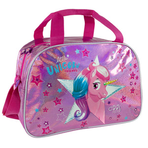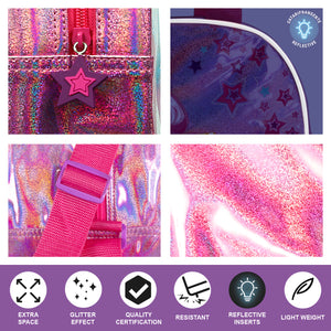 Borsa sport per piscina, palestra o altri sport con stampa unicorno per bambina dai 2 ai 5 anni. Tiralampo gommata a forma di stella rosa e viola. Stampa frontale di un Unicorno su sfondo rosa brillantinato con dettagli catarifrangenti che riflettono le luci delle macchine anche al buio: in questo modo la tua bambina sarà al sicuro con stile!