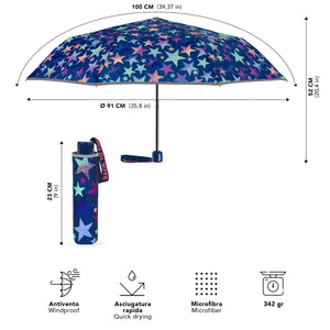 Questo ombrello mini per bambina con sfondo blu e tante stelline colorate è un vero cielo in miniatura! Piccolo, leggero e super pratico, è perfetto per trasformare ogni goccia di pioggia in un gioco scintillante. Facile da portare nello zaino, pronto a brillare ogni volta che le nuvole fanno capolino. I profili dell'ombrello sono catarifrangenti e garantiscono un'alta visibilità anche nelle giornate piovose o nelle ore notturne. L'apertura è manuale e facilitata grazie al pratico sistema salva-dito che assicura la massima sicurezza, anche mediante puntine arrotondate e fissate. Ideale per bambine a partire dai 7 anni.