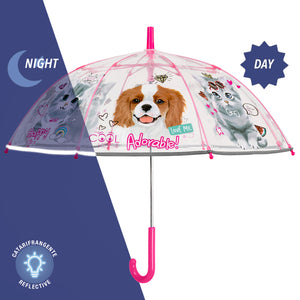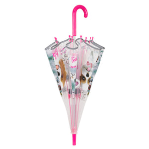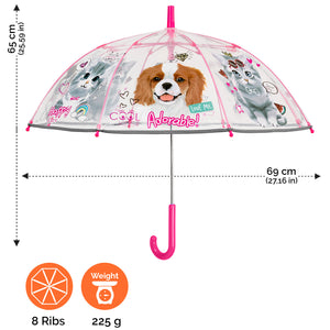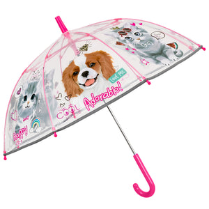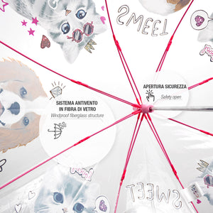 L'ombrello trasparente a cupola con teneri cagnolini e gattini darà un tocco di magia alle giornate di pioggia. La tua bimba sarà accompagnata ogni giorno da simpatici cuccioli che renderanno più calorose anche le fredde giornate uggiose. I profili catarifrangenti di questo accessorio da pioggia garantiscono il massimo della visibilità anche durante le giornate più buie, perché capaci di riflettere la luce e di illuminarsi quando incrociano i fari delle automobili. Le bacchette in fibra di vetro garantiscono un'ottima resistenza al vento. Il materiale POE di cui è costituito l'ombrellino è completamente privo di sostanze tossiche. Dotato di apertura manuale facilitata grazie al pratico sistema salva-dito adatto a bambine dai 3 ai 6 anni.