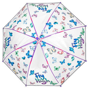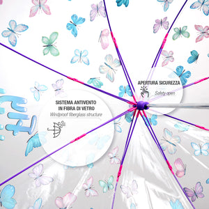 L'ombrello trasparente a cupola con farfalle colorate è una vera gioia per le giornate di pioggia! Questo accessorio da pioggia è dotato di profili catarifrangenti che garantiscono massima visibilità anche durante le giornate buie. Le bacchette in fibra di vetro assicurano una resistenza al vento da urlo. Il materiale POE di cui è costituito l'ombrellino è completamente privo di sostanze nocive. In più, l'apertura manuale è facilitata grazie al pratico sistema salva-dito, perfetto per le bambine dai 3 ai 6 anni.
