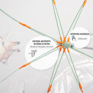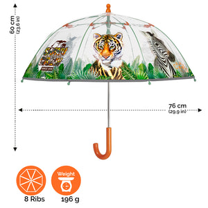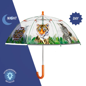 Questo simpatico ombrellino trasparente a cupola con stampe di tigri e zebre è un accessorio unico che trasporterà i tuoi bimbi nella Savana. I profili catarifrangenti di cui è dotato garantiscono la massima visibilità in quanto capaci di riflettere la luce e illuminarsi quando incrociano i fari delle auto. Gli ombrelli della linea COOL KIDS presentano bacchette in fibra di vetro che rendono l'accessorio resistente alle raffiche di vento. L'apertura dell'ombrello è manuale e facilitata grazie al sistema salva-dito, ideale per i bambini dai 3 ai 5 anni.