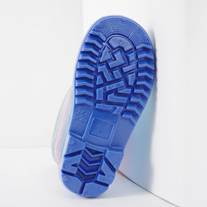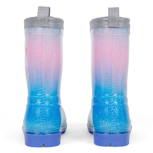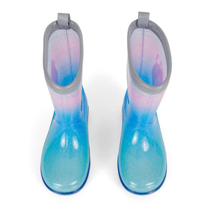 Stivaletti da pioggia per bambina con sfondo glitterato e sirenetta. L'accessorio perfetto per immergersi nel mondo dell'oceano e delle sue creature magiche, anche grazie ai suoi delicati colori sfumati che vanno dall'azzurro al lilla e alla fantasia glitter. I profili catarifrangenti dei nostri stivali da pioggia garantiscono un'alta visibilità anche durante le giornate più buie e le ore notturne perché capaci di riflettere la luce: camminare sotto la pioggia sarà ancora più sicuro!