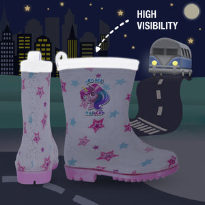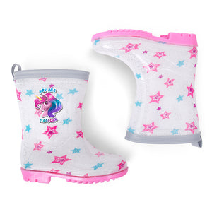Le giornate di pioggia non sono mai state così fashion! Stivaletti da pioggia bianchi glitterati con stelle rosa e azzurre e stampa di unicorno laterale per bambine. I profili sono catarifrangenti garantendo in questo modo il meglio della visibilità anche durante le giornate più buie perché capaci di riflettere la luce. Grazie ai nostri stivaletti camminare sotto la pioggia sarà ancora più sicuro. Realizzati in PVC con interno foderato in cotone, sono facili da pulire e comodi da indossare. La suola di colore rosa è antiscivolo: la punta e il tallone rinforzato consentono una maggior aderenza e stabilità su ogni tipo di terreno. Perfetti per camminare e giocare sotto la pioggia, mantenendo i piedi asciutti. I materiali utilizzati sono privi di sostanze tossiche rispettando salute e ambiente. I prodotti della linea COOL KIDS si contraddistinguono per essere colorati, sicuri, divertenti e super COOL!
