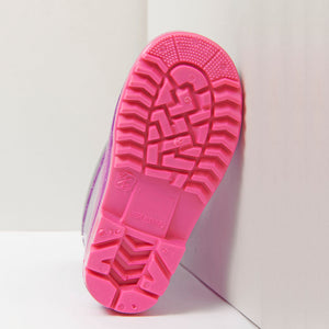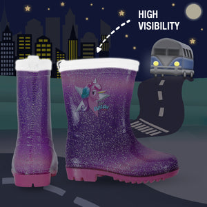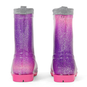 Stivaletti da pioggia viola e rosa sfumato con stampa di unicorno laterale per bambine. profili sono catarifrangenti garantendo in questo modo il meglio della visibilità anche durante le giornate più buie perché capaci di riflettere la luce. Grazie ai nostri stivaletti camminare sotto la pioggia sarà ancora più sicuro. Realizzati in PVC con interno foderato in cotone, sono facili da pulire e comodi da indossare. La suola di colore in contrasto, è antiscivolo: la punta e il tallone rinforzato consentono una maggior aderenza e stabilità su ogni tipo di terreno. Perfetti per camminare e giocare sotto la pioggia, mantenendo i piedi asciutti. I materiali utilizzati sono privi di sostanze tossiche rispettando salute e ambiente. I prodotti della linea COOL KIDS si contraddistinguono per essere colorati, sicuri, divertenti e super COOL!