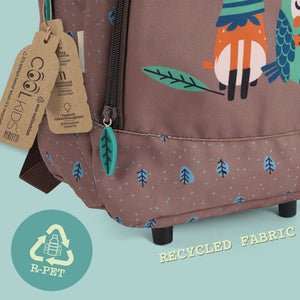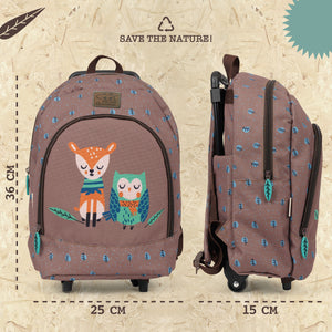 Questo zaino con trolley staccabile fa parte della linea Cool Kids Eco Collection che comprende accessori realizzati con tessuti R-PET provenienti dal riciclo delle bottiglie di plastica. Una scelta ecologica, un regalo utile da portare con sé nel tempo libero e alla scuola materna per contenere giocattoli e accessori. I dettagli catarifrangenti sugli spallacci garantiscono visibilità anche nelle giornate più buie. La stampa colorata di un cerbiatto e di un gufo con piccole foglie azzurre ci riportano al mondo della natura per imparare ad amarla fin da piccoli e prenderci cura del nostro pianeta. Praticità, spazio e materiali riciclati per un mondo green!