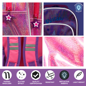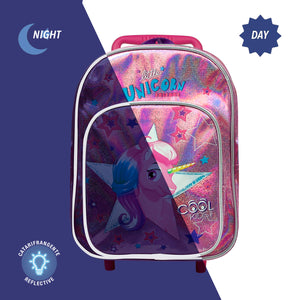 Zainetto con rotelle per bambina dai 3 ai 6 anni. Ideale per la scuola materna e per il tempo libero. La tasca frontale permette di tenere a portata di mano gli accessori più utilizzati. Le rotelle e il manico allungabile sono staccabili così da poterlo utilizzare come zainetto a spalla o come piccolo trolley. Stampa frontale di un Unicorno su sfondo rosa brillantinato con dettagli catarifrangenti che riflettono le luci delle macchine anche al buio: in questo modo la tua bambina sarà al sicuro con stile!