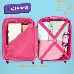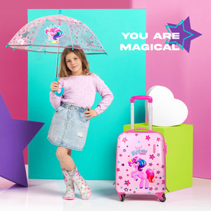 Trolley rigido rosa da bambina con stampa unicorno. Pratica valigia da bimbo in ABS, materiale rigido, ultraleggero e con elevata resistenza ai graffi e agli urti. La struttura interna è composta da 2 divisori richiudibili. Chiusura sicura grazie al lucchetto con combinazione personalizzabile e 4 ruote girevoli che garantiscono stabilità e comfort di trasporto su tutte le superfici.