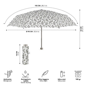 Ecco il perfetto connubio tra estetica botanica e massima portabilità, ideale per chi cerca una protezione invisibile in borsa ma prontamente efficace. Nonostante le dimensioni super ridotte, questo ombrello vanta una struttura antivento capace di resistere a raffiche improvvise senza ribaltarsi, garantendo una stabilità eccezionale durante i tuoi spostamenti. Il tessuto ad asciugatura rapida consente di riporre l'ombrello quasi subito dopo l'uso. Leggerissimo, maneggevole e rifinito con uno stile elegante e colorato, è l'accessorio indispensabile per affrontare la pioggia con praticità e un tocco di classe senza alcun ingombro.