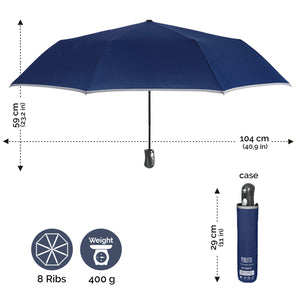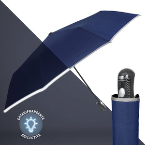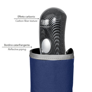 Ombrello tascabile unisex ultraleggero, ideale da portare nello zaino, di colore blu. Innovativi profili catarifrangenti che lo rendono super sicuro soprattutto durante le passeggiate nelle ore più buie. Dotato di struttura antivento con bacchette in fibra di vetro che rendono l'ombrello resistente e super flessibile. Tessuto a trama fitta con speciale resinatura che garantisce un'asciugatura super rapida. Apertura automatica azionabile dal pulsante posizionato sull'impugnatura ad effetto carbonio.