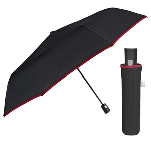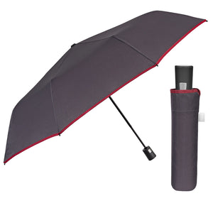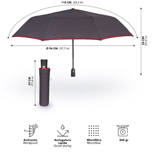 Un modello tinta unita classico per chi è alla ricerca di uno stile che unisca semplicità e raffinatezza. Il bordino rosso dona un tocco di eleganza ai toni scuri della tela. La struttura antivento e resistente con bacchette in fibra di vetro rende l'ombrello flessibile e ultraleggero. Il tessuto è a trama fitta con speciale resinatura idrorepellente ad asciugatura rapida. L’apertura è automatica, facilitando l'utilizzo. Tutto quel che desideri per conciliare praticità ed eleganza.